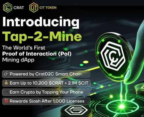 As the first-ever Proof of Interaction (PoI) mining protocol on the CratD2C Smart Chain, Tap-2-Mine offers seamless crypto earnings ($CRAT and $CIT), scalable community growth, and democratised access to blockchain participation, all from the convenience of a mobile device.